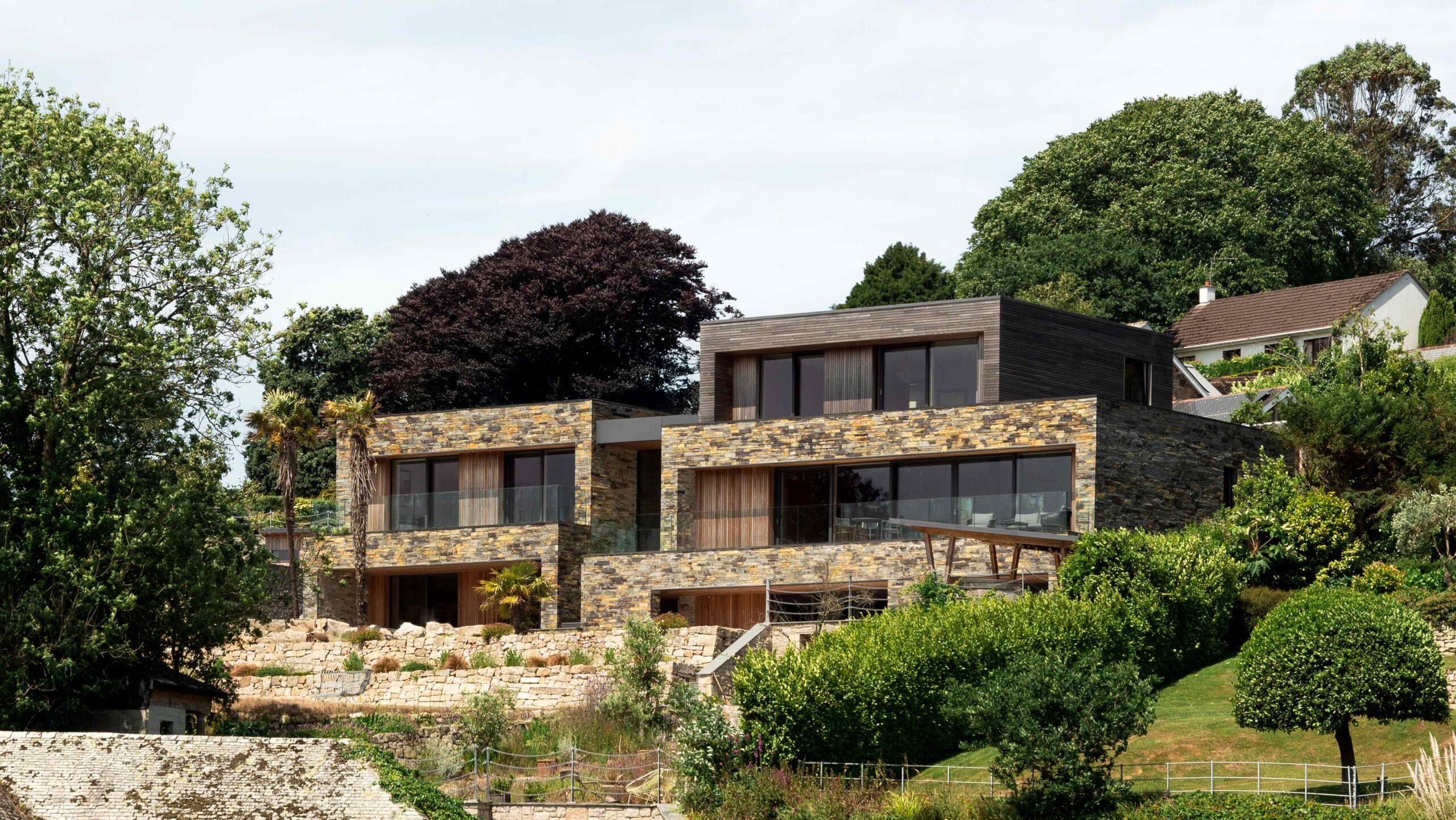 Local stone on the lower two storeys connects the building to its surroundings, while the cedar cladding on the top floor helps it blend into the woodland visible behind the property and around the creek.