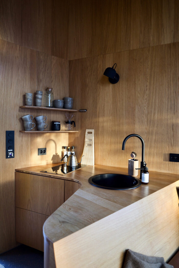 Constructed by the craftsmen of Sigurd Lende AG, the restricted palette of natural materials lends a calm simplicity to tiny living space, with the plain, varnished oak and brown leather upholstery of the bespoke beds and cabinetry.