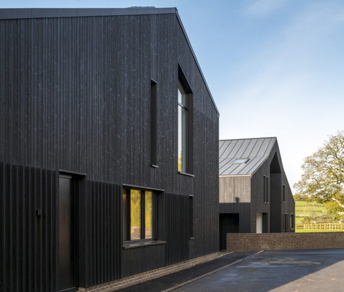 They kept to the proposed building footprints, but created new internal layouts and radically altered the homes’ external appearance to feature charred timber cladding and black zinc roofs, rather than the pale timber originally proposed.